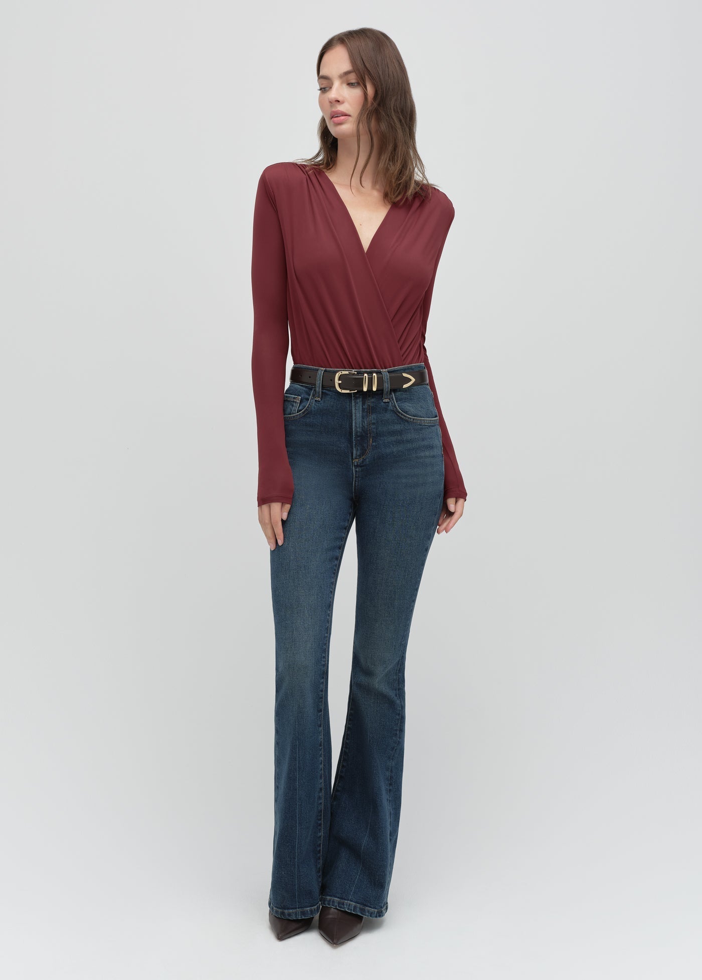 A super high-rise jean with a leg-lengthening fit, asymmetrical outseam, and flared hem.