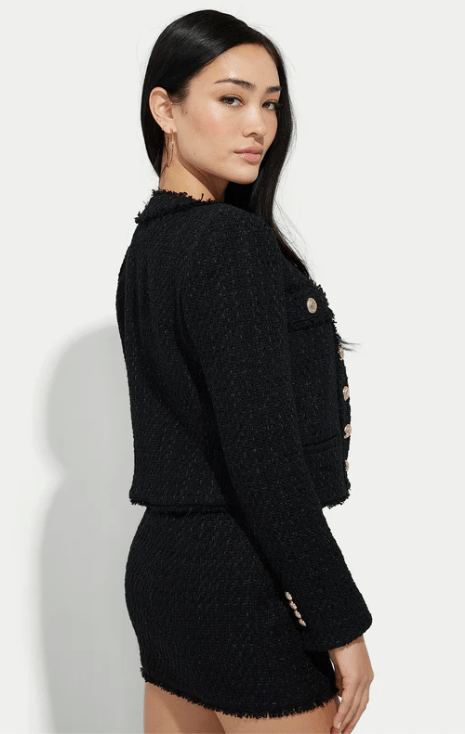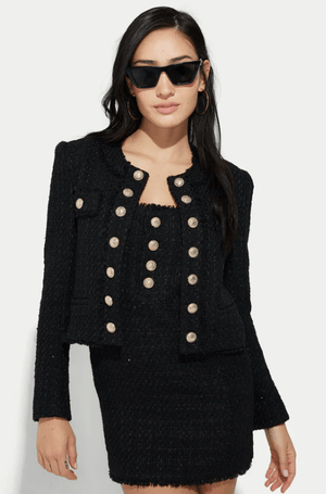 The Karson jacket takes tweed to a totally new level. Super shiny lurex upgrades classic tweed, while tons of chic buttons and fun frayed trim dial up the details. A luxe layer that's sure to stun on your next trip to Paris. Generation Love’s tweed is crafted with recycled fabric.