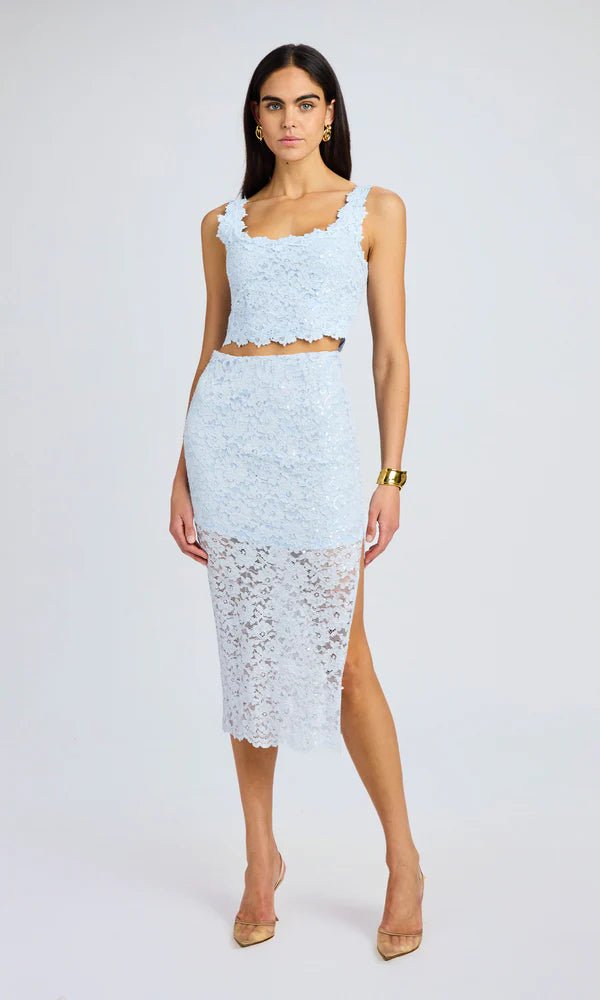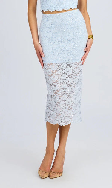 Featuring a side slit, sheer lace that subtly highlights the legs, and sequin embellishments for a touch of sparkle, along with a miniskirt lining for a refined finish, this skirt is an essential for commanding attention.
