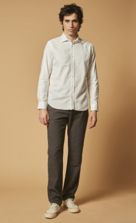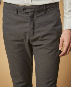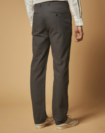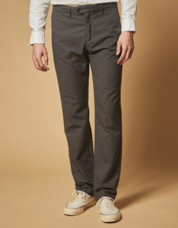 Dark navy overdyed houndstooth cotton. Two side patch pockets and a piped buttoned back pocket. Belt loops and zip fly.