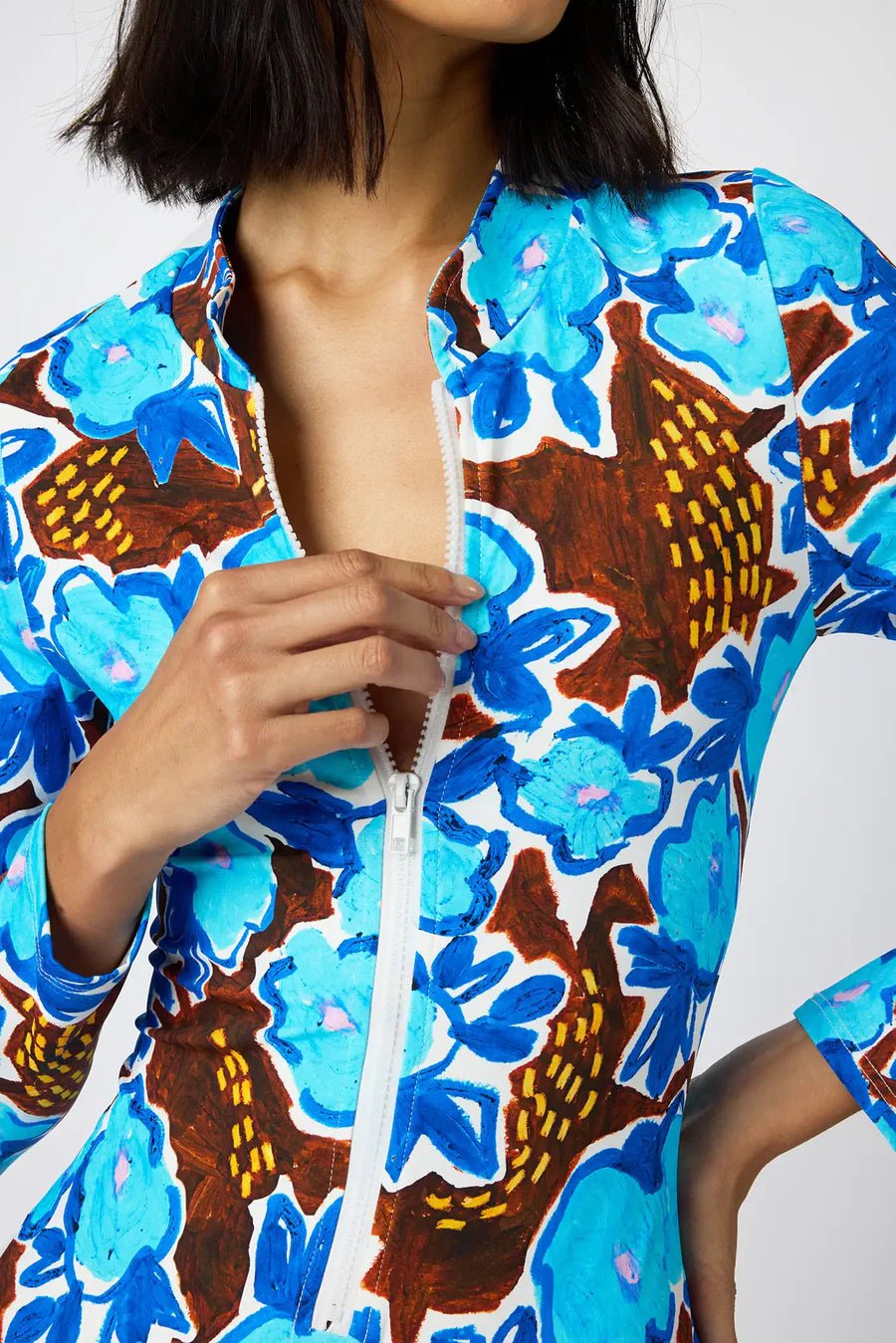 FINAL SALE Designed for those who want maximum coverage without sacrificing style, our new long-sleeve one-piece rash guard is for you! Featuring a classic crew neck and a 3/4 length front zipper for easy wear, this suit blends sun protection with effortless elegance.