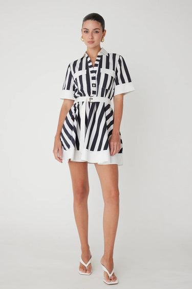 Striking black and white stripes steal the show in this sophisticated Yana dress, a playful take on timeless elegance. Crisp white poplin trim adds a polished finishing touch that elevates the look from casual to chic in seconds. Whether you're heading to brunch with friends or a sunset dinner date, this dress is your go-to companion. Pair it with heels for refined occasions or slip on sandals for carefree weekend adventures—the versatility is endless. Crafted from breathable 100% cotton and designed unlined for comfort, it features a front button closure, side invisible zipper, and an included belt to cinch and customize your silhouette. A wardrobe essential that proves stripes never go out of style, the Yana balances playful pattern with timeless appeal, making it the dress you'll reach for again and again.