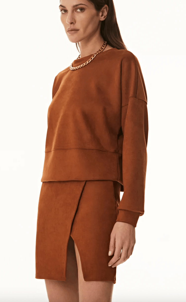 Cut from soft sueded fabric, this stylish mini skirt features a front slit achieved through overlapping panels Complete this look: Pair with our Banded Pullover done in the same sueded fabric for a luxe monochromatic look, or wear with any of our knit tops in coordinating colors.