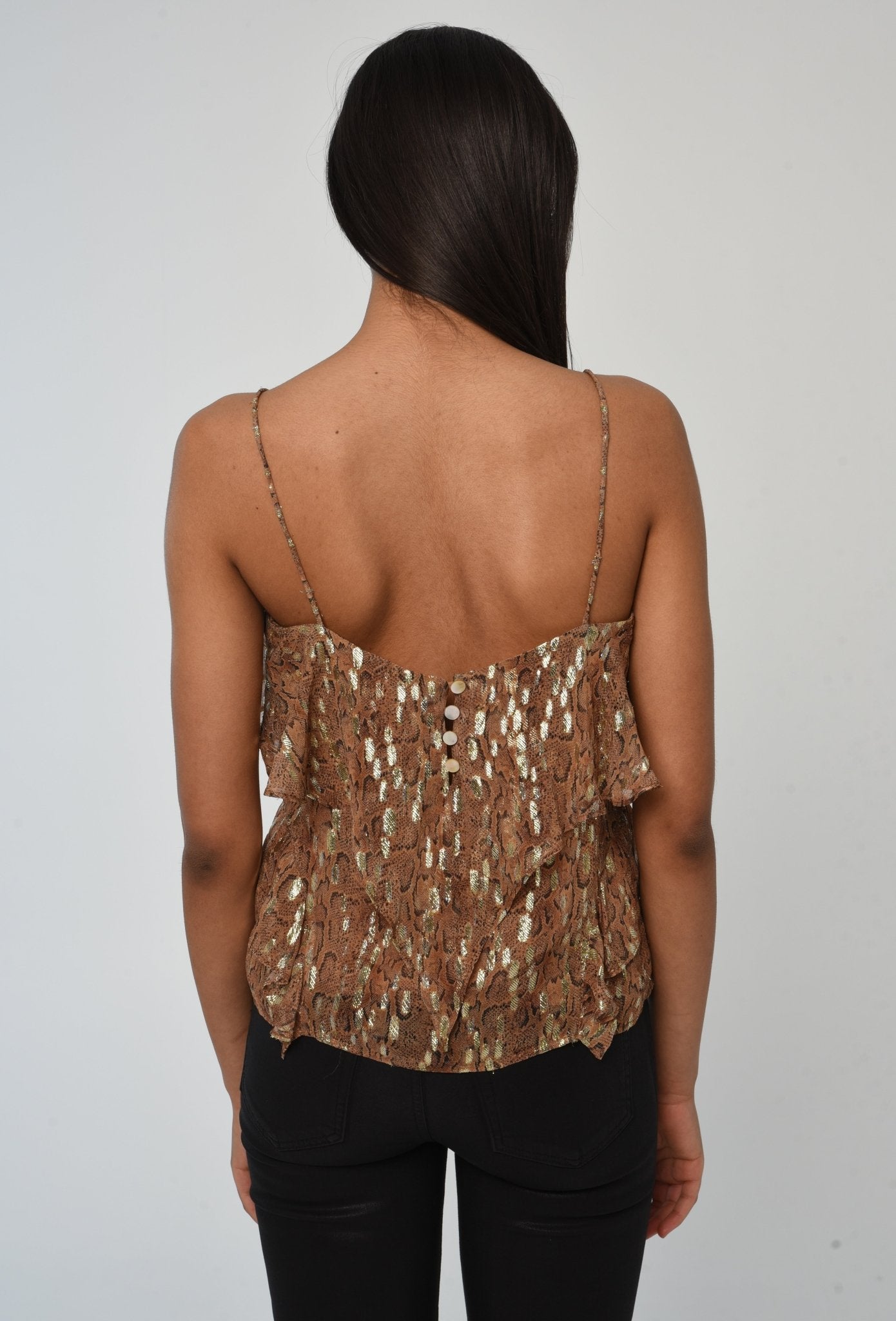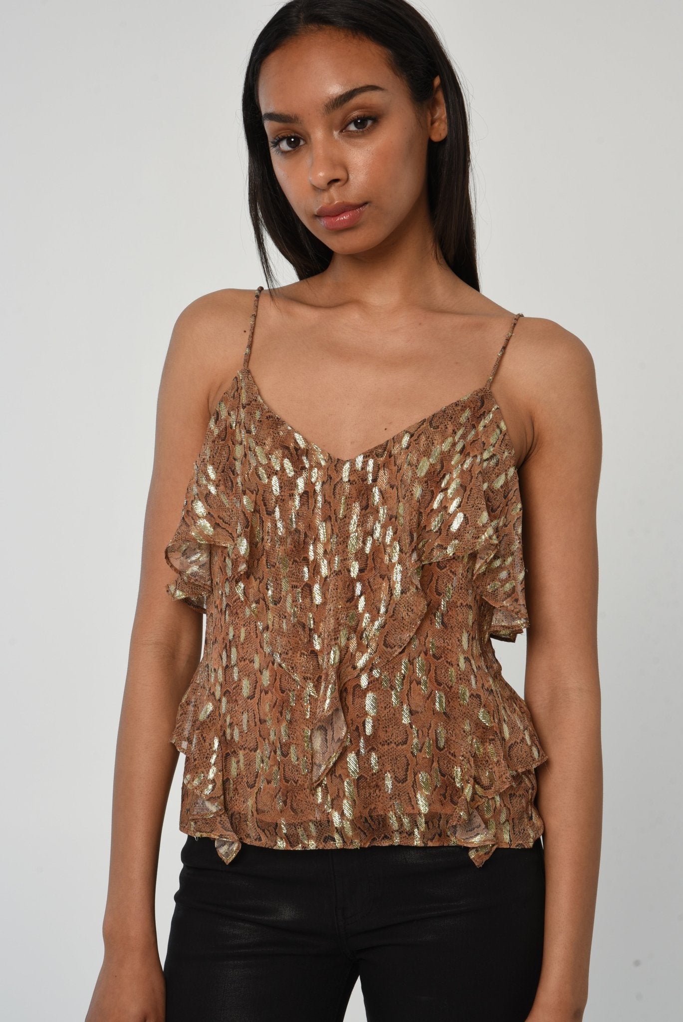 The Lilly Cami in the Cavalier Python Print, is our favorite party top for this season! The print has accents of gold lurex throughout it