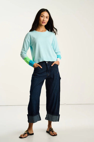 The Block Party knit features a unique and eye-catching color-blocking design at the sleeves and cuffs, adding a playful yet sophisticated touch. Its relaxed fit and laid-back drop shoulder ensure effortless wearability and a flattering silhouette for various body types. Finishing details include classic ribbed trims at the neck, cuffs, and hem, enhancing its durability and timeless appeal. Whether you're enjoying a casual outing or adding a pop of color to your everyday ensemble, this aqua knit pullover is an ideal choice.