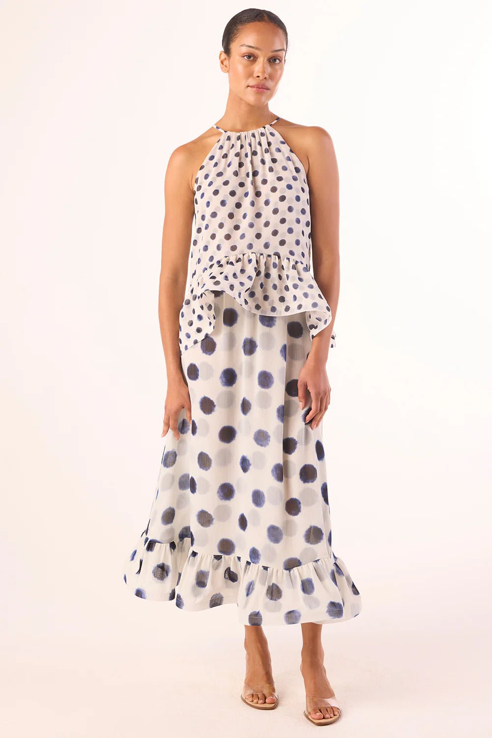 Elevate your wardrobe with the sophisticated and stylish Misa Faith Halter Top. This elegant women's top, crafted from lightweight 100% Poly Chiffon, features a charming small-scale navy polka dot print on a crisp white background, offering a timeless yet contemporary aesthetic.