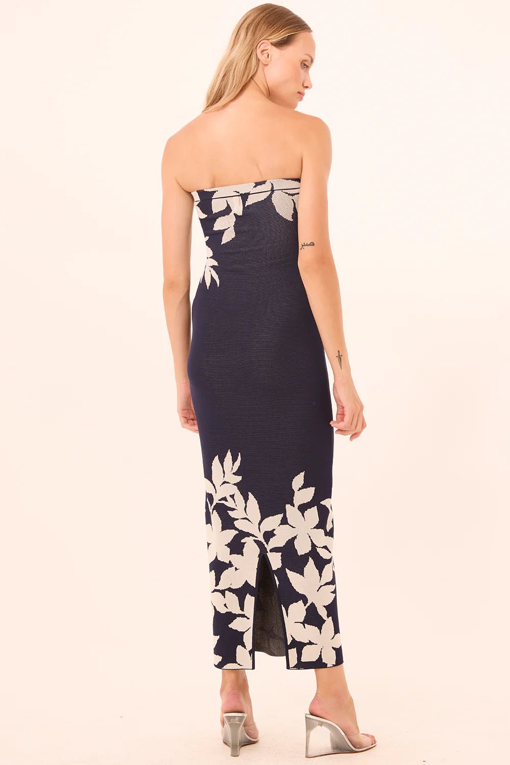 The Willow dress is a chic strapless maxi cut from a fitted stretch knit jacquard. Designed in a sleek bodycon silhouette, it features a banded elastic at the bustline for a secure fit and a back slit for ease of movement. Finished with a white floral motif on a navy ground, Willow transitions effortlessly from day to night and can be dressed up or down.