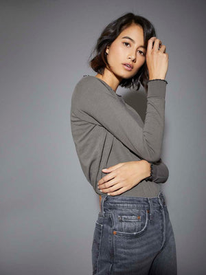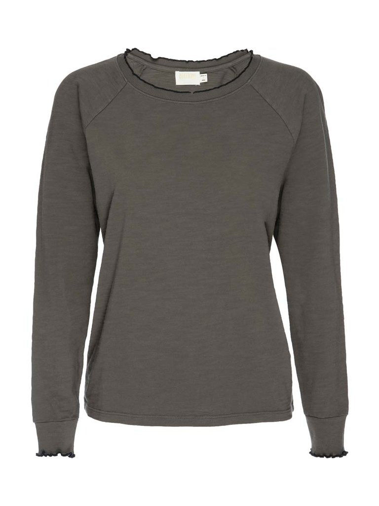 Contrast lettuce-edge detailing at the cuffs and neckband adds a hint of femininity to this military-inspired style.