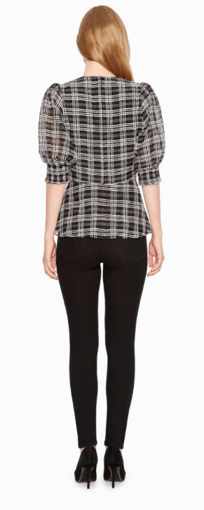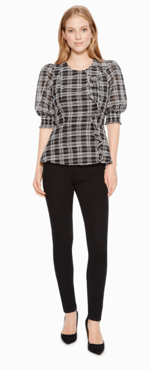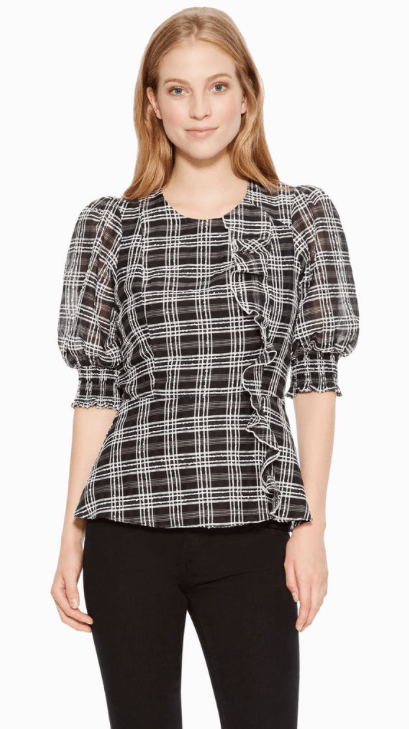 Parker reworked menswear-inspired plaid into an uber-feminine silhouette for the season. Puffed sleeves are cinched with smocking at the elbow and its fitted waistline flares out into a peplum shape. Finished with a ruffle that ripples down the side, this top is ideal for on- or off-duty occasions.