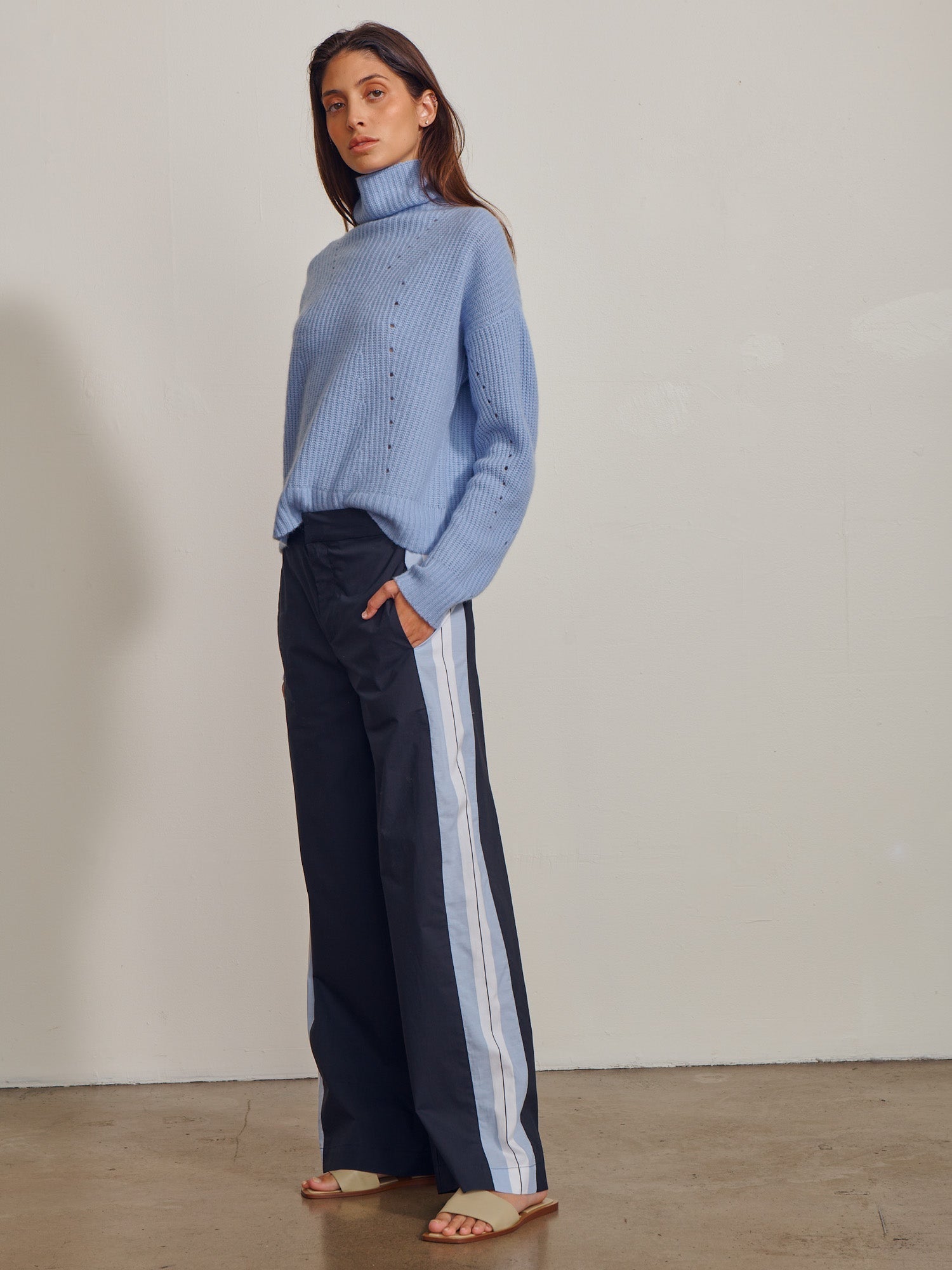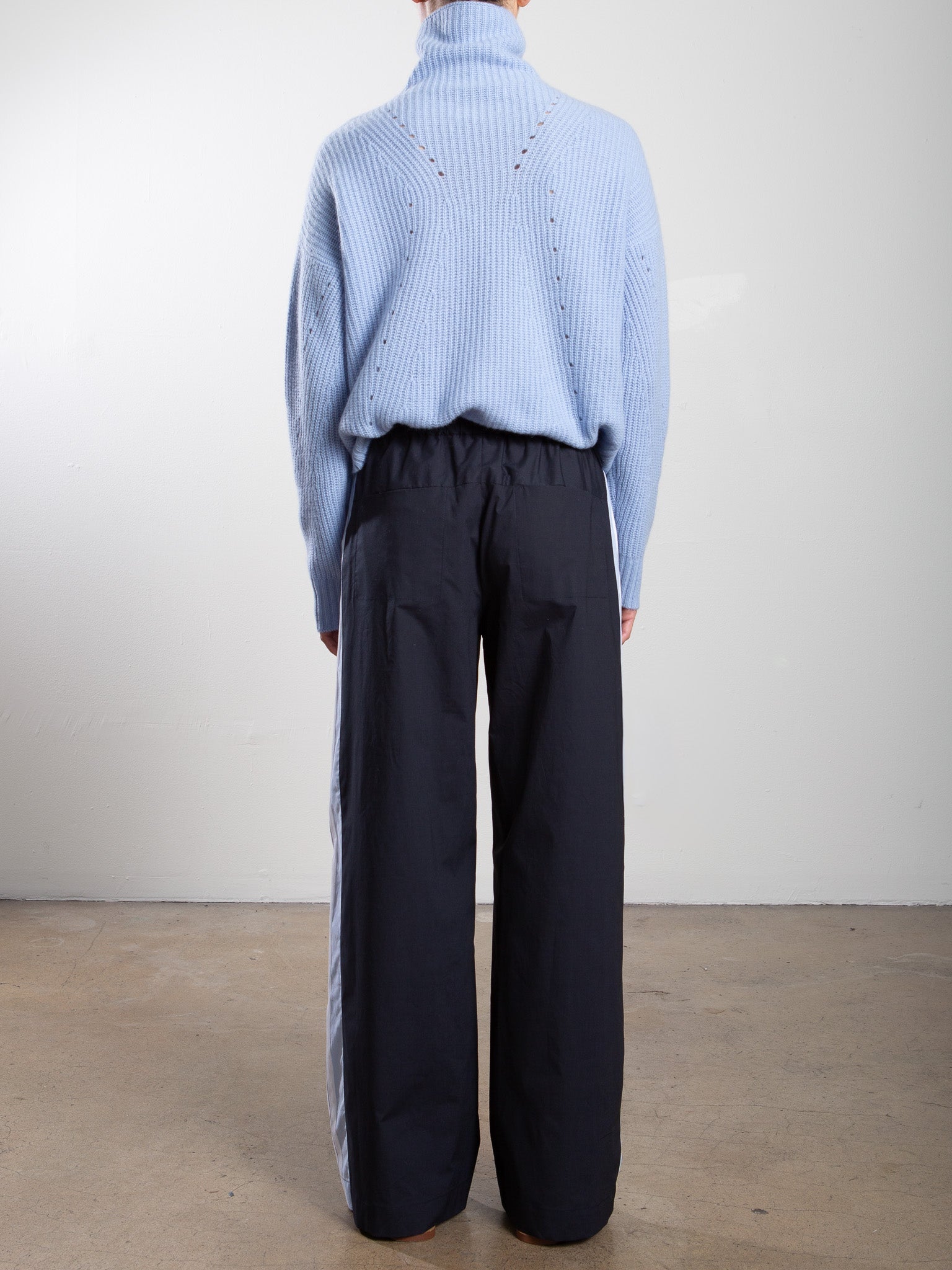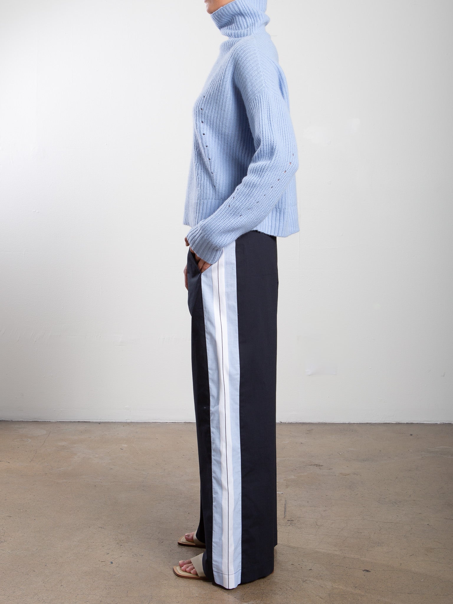Wide-leg trouser in stretch cotton poplin with striped blue and white side panel. Has a clean flat-front waistband and elastic in back for ease of wear.
