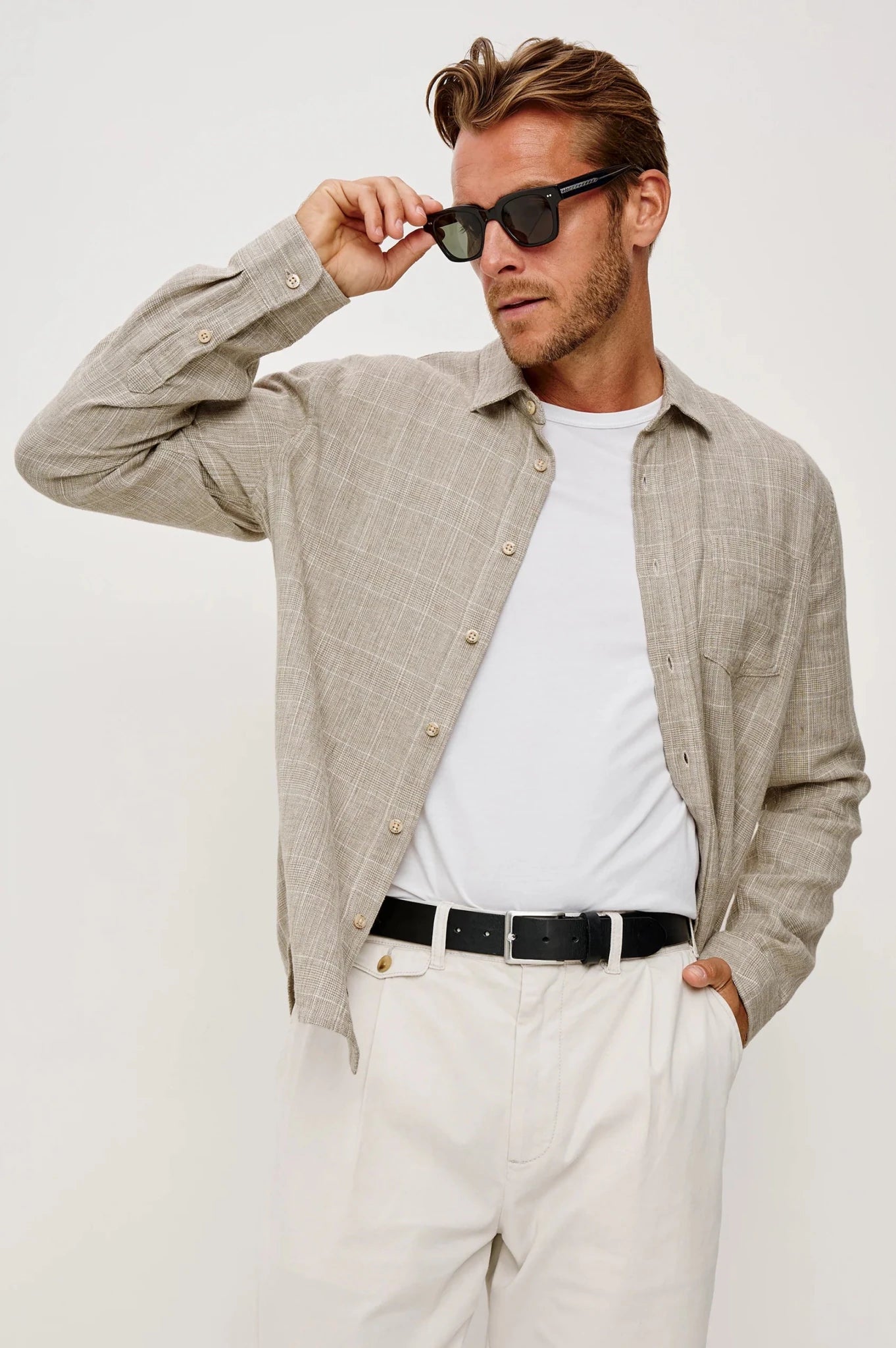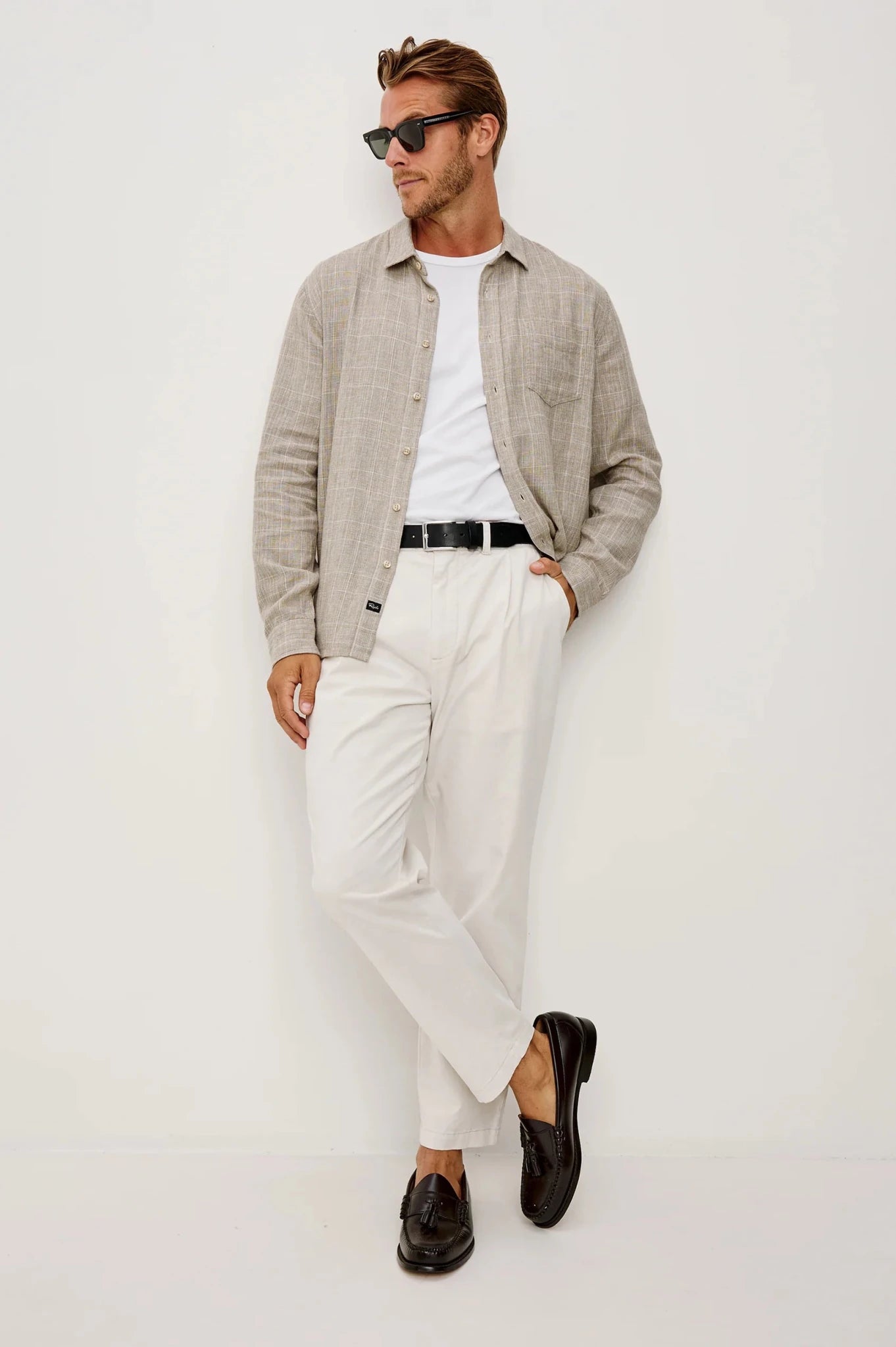 Keywords: Men's button-up shirt, Rails Gracy, Bulgur Cream, houndstooth shirt, linen cotton blend, relaxed fit shirt, long sleeve shirt, men's casual shirt, breathable shirt, summer shirt, spring shirt, classic collar, chest pocket, premium men's clothing.
