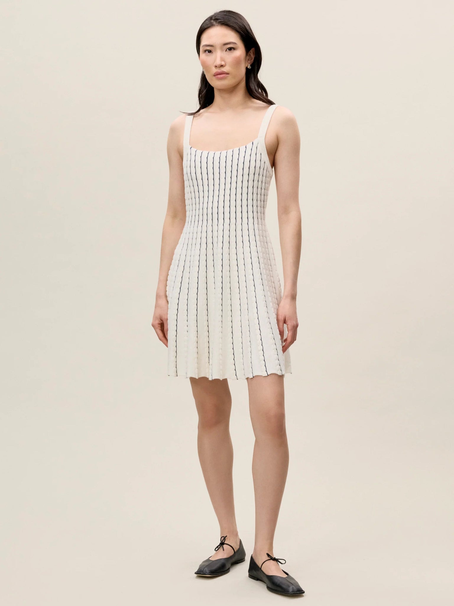 The Dorothy Knit Dress in ivory is a charming blend of texture and elegance. Featuring intricate scallop rib stitching, this mini dress adds a playful yet sophisticated touch to your wardrobe. Crafted from a soft cotton blend with lyocell, it offers a comfortable, lightweight feel that's perfect for warm-weather occasions.