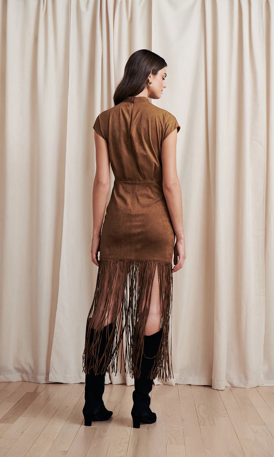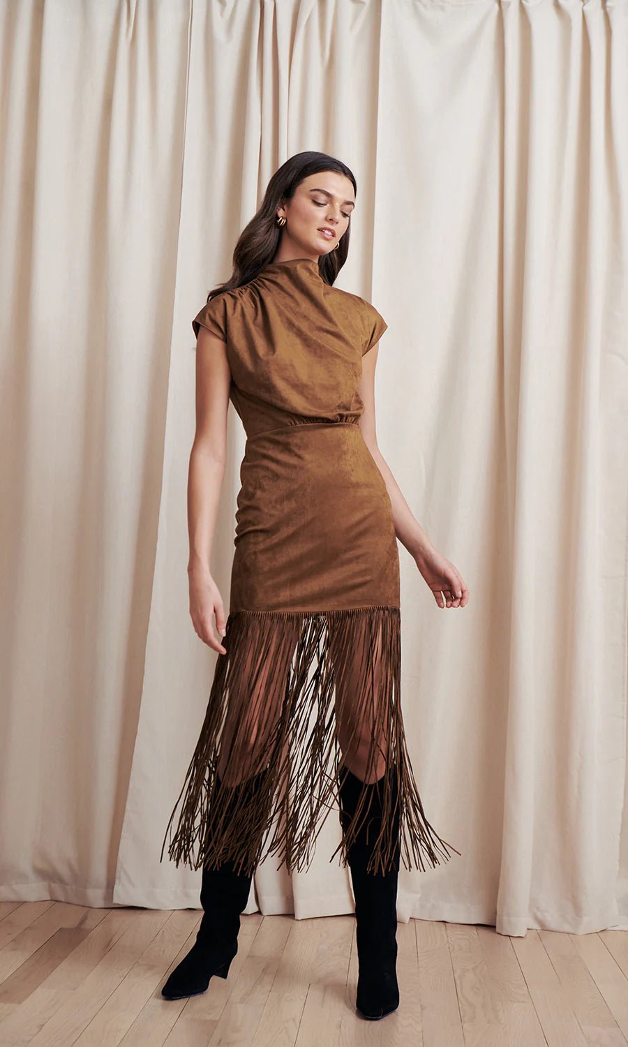 Luxe brown: brown is the of the moment hue and our Astelle midi has you covered! The cool-caramel dress is made from a taupe colored faux suede fabric. Astelle's skirt is finished with a fun fringe trim. Pair the suede piece with knee high boots for an autumnal look.