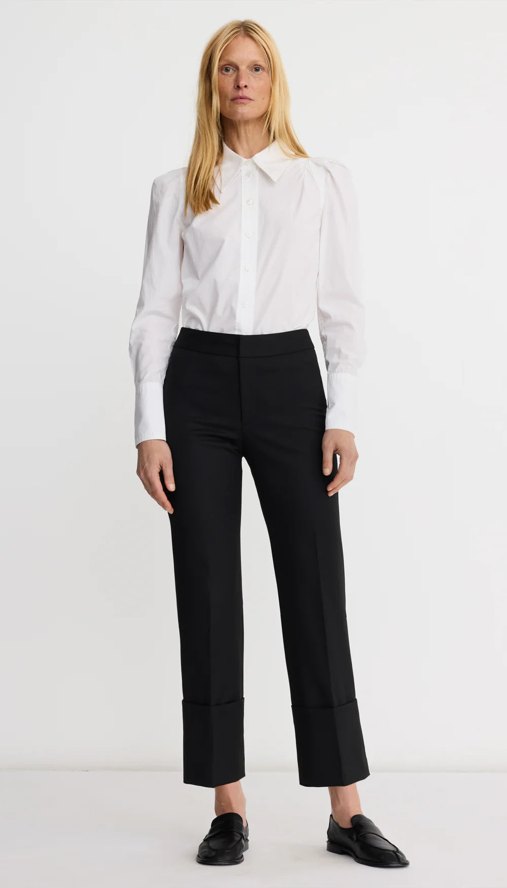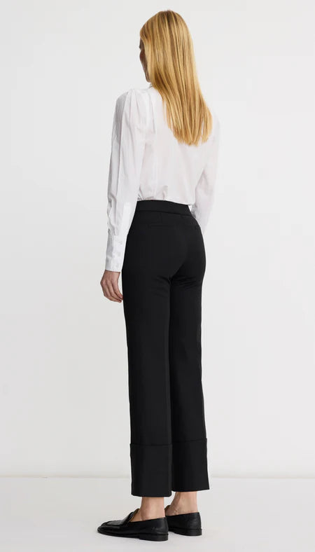 Style Notes: Designed to show off an ankle and your favorite shoe, this crisp, cuffed stretch pant is equally chic on its own or paired with its coordinating Duchess Blazer as a suit. The versatile mid-rise sits perfectly at your natural waist, creating a flattering silhouette that moves with you throughout the day. Fitted through the waist and hips with a straight cropped leg, these pants strike the perfect balance between polished and playful. The standout wide cuffed hems add a directional edge that elevates any outfit—whether you're dressing them up with heels or keeping it casual with sneakers. The premium fabric blend of 68% Polyester, 29% Viscose, and 3% Elastane offers a luxurious drape with just enough stretch for all-day comfort. Dry Clean Only.