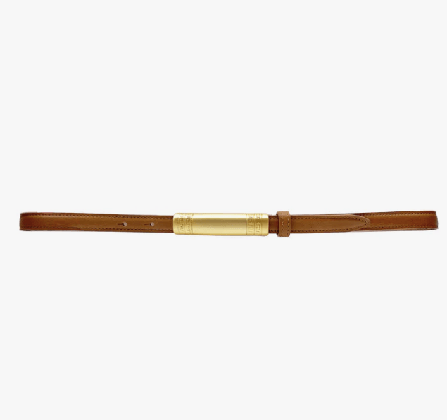 Tan Italian feather edge belt with matte gold prong closure buckle
