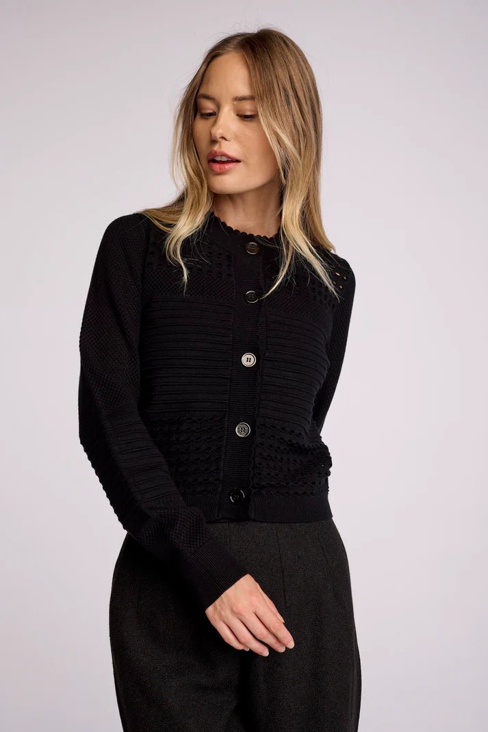 Blondie is made in our signature Snowy Soft Yarn in a feminine pointelle stitch. The cardigan features a full button front and mixed stitch detailing with a slim fit through the body. Finished with rib trim at the neck and sleeve, Blondie is the perfect length to finish right at your waistband. Shown styled as a twinset with the Zane tank.