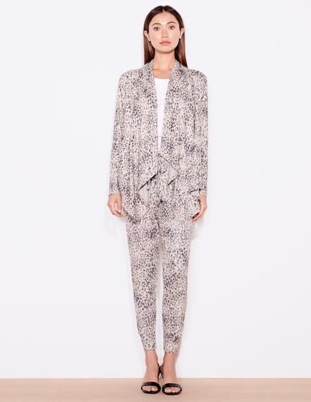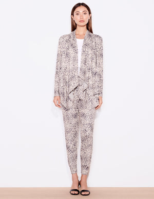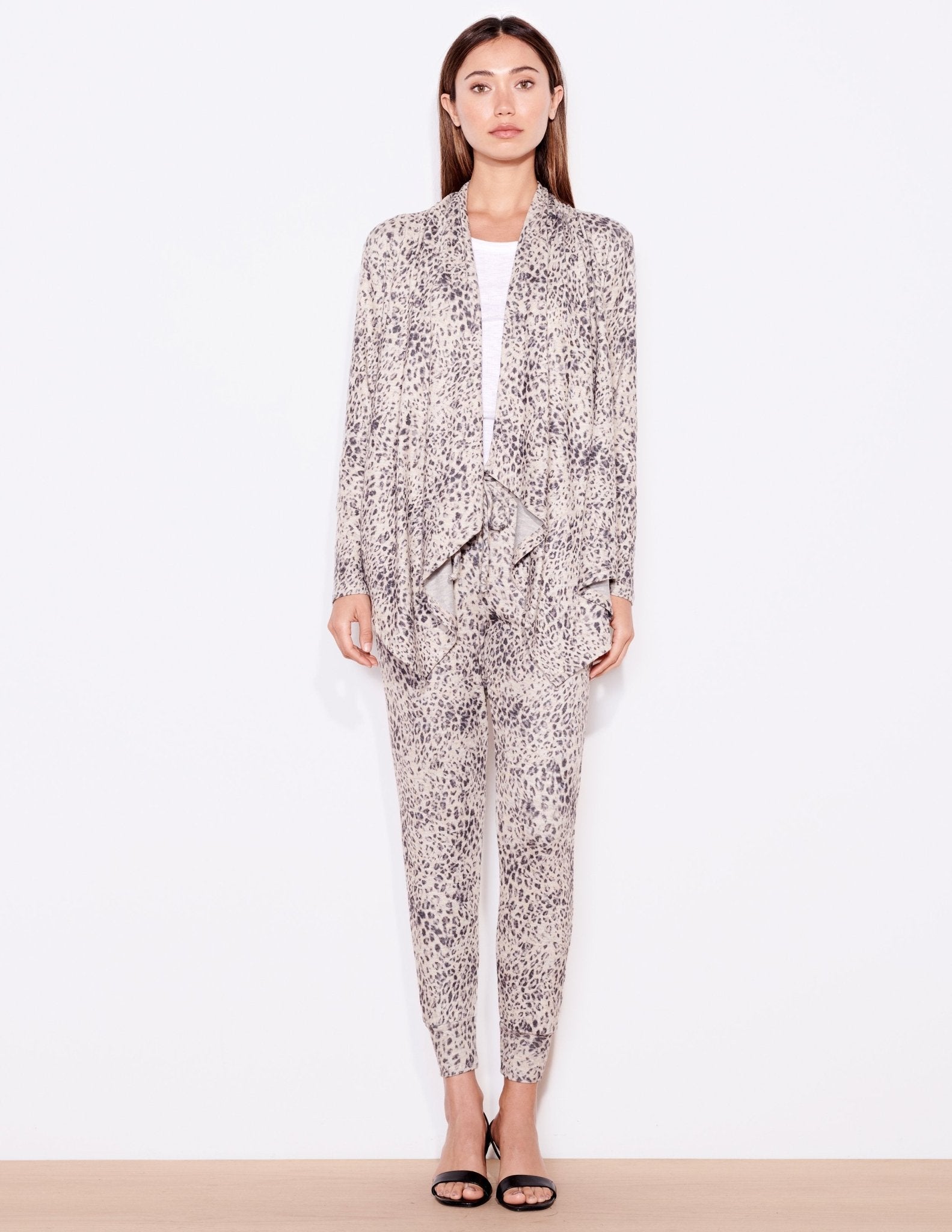 A waterfall cardigan in a soft sweater-knit material. Featuring center back seam.