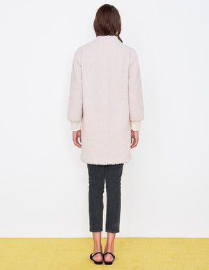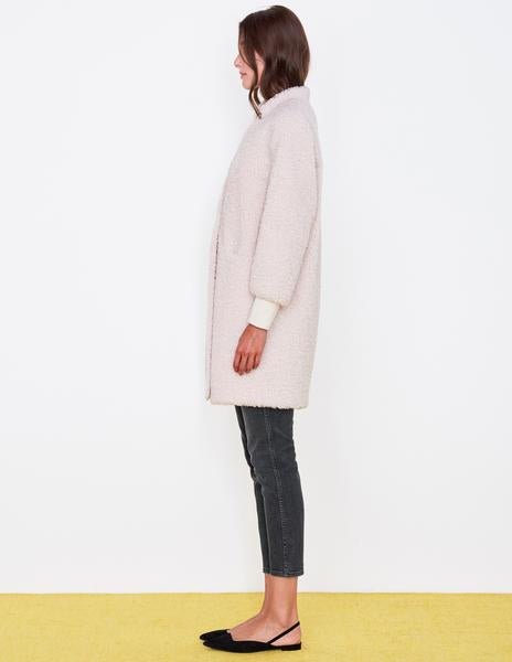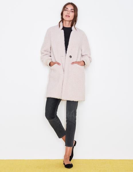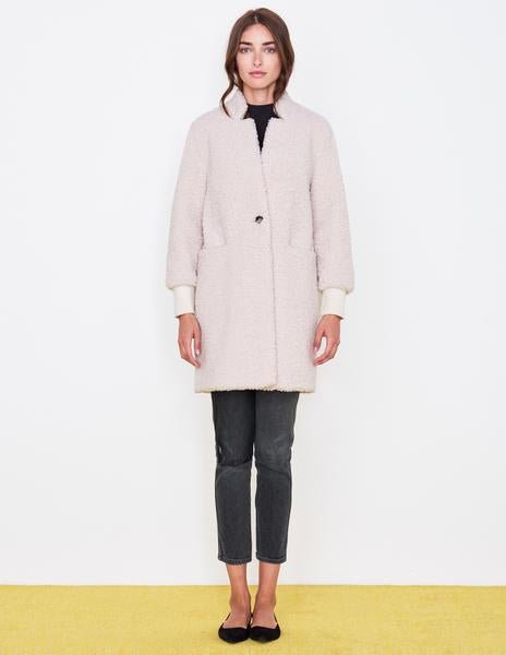 A lighter-weight sherpa coat. Featuring a notch collar, cuff sleeves, single-button closure and metropolitan cities printed on the inside lining.