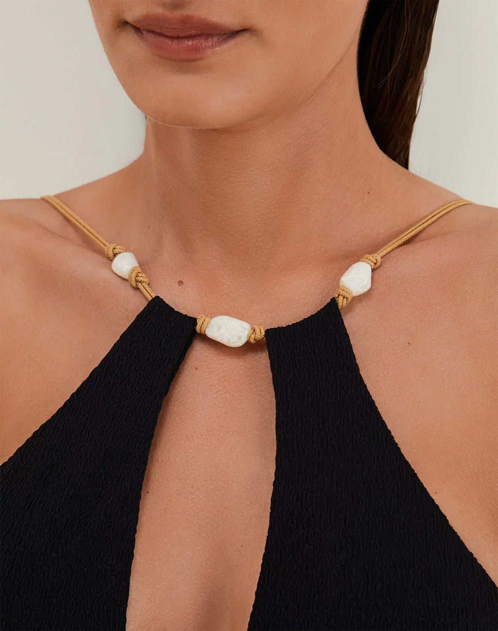 The ViX Firenze Ney Top is a statement piece featuring a round neckline embellished with shell-like beads, a bold front keyhole, and adjustable shoulder straps for a customized fit. Designed for both style and ease, it fastens at the back with a sleek magnetic clasp closure.