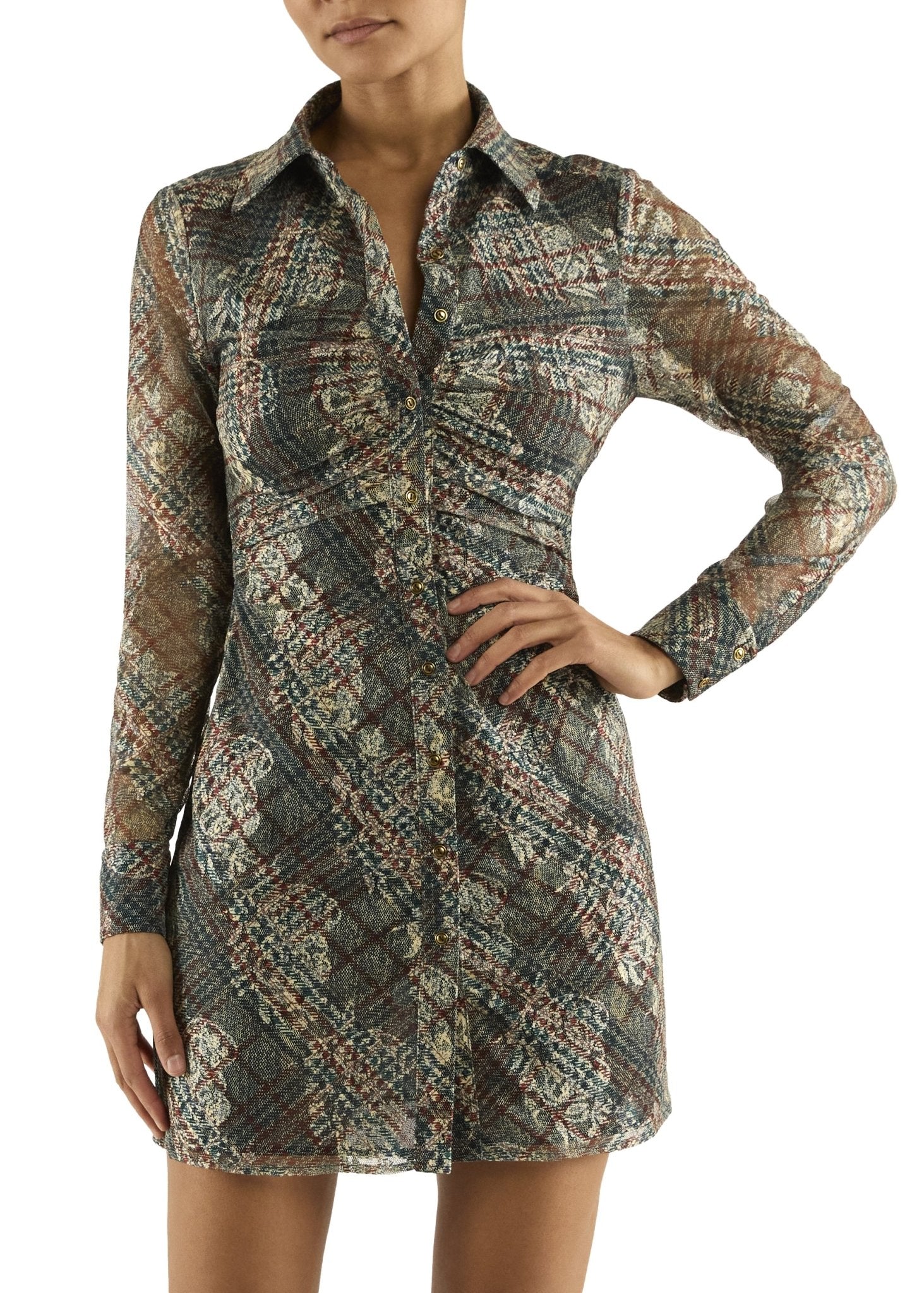 Ramy Brook Wyatt Mesh Button Down Mini Dress in Amber Plaid Ramy Brook Wyatt Mesh Button Down Mini Dress in Amber Plaid