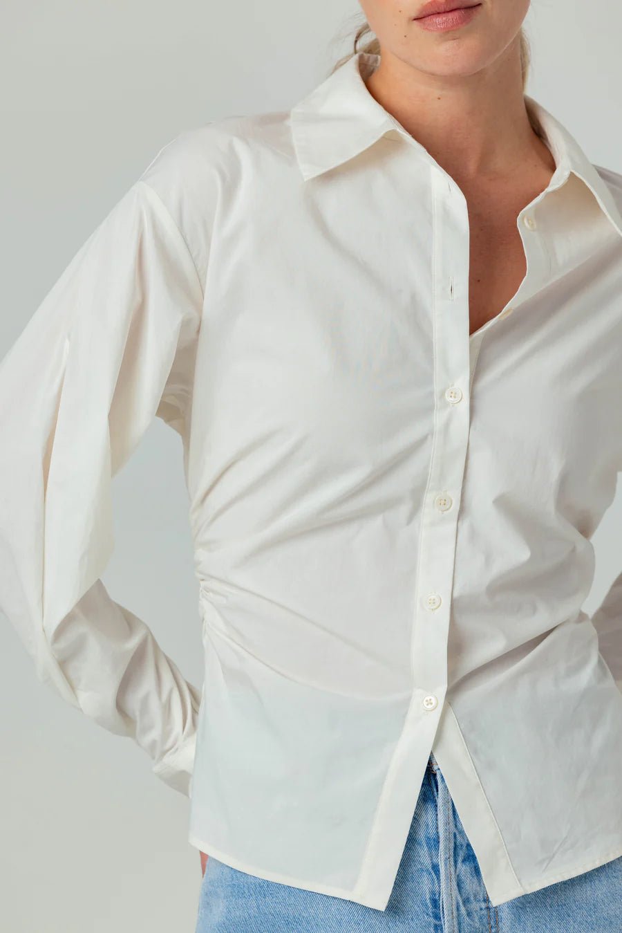 A signature Sundays update to the classic white poplin button-up. Zariah features flattering side-body ruching for a feminine, sculpted silhouette, contrasted by voluminous sleeves for a modern sense of ease. This top is slimming and considered true to size. The length will finish just waist the waistband of most wearer's favorite mid-rise jeans.